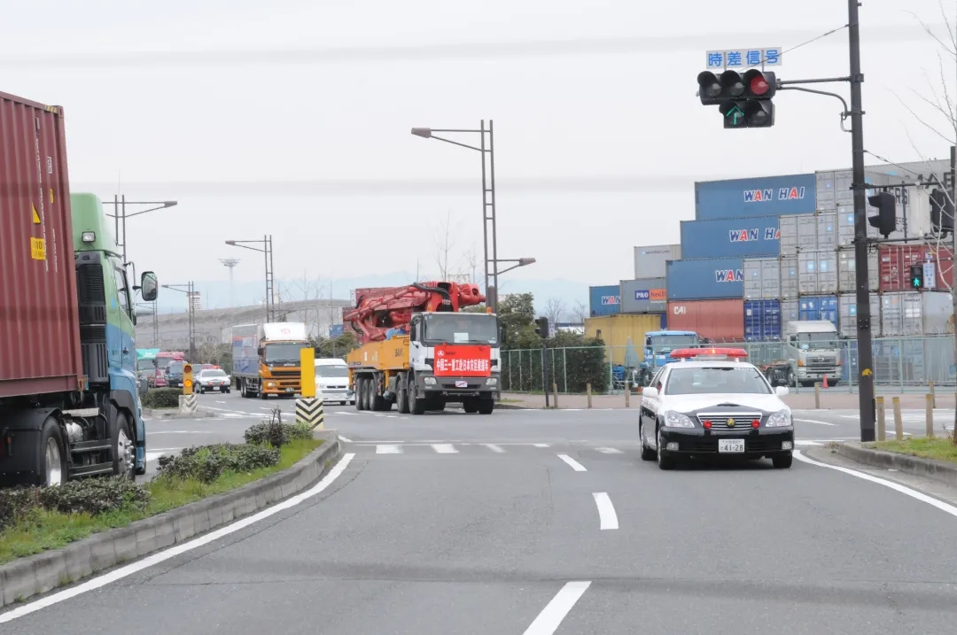 泵车几乎是从船上直接开出港口,以往所有繁琐的通关手续都免了。原来,为了让这台泵车尽早开到福岛第一核电站,日本外务省、国土交通省事先规划好行车路线,一路由警车开道护送。