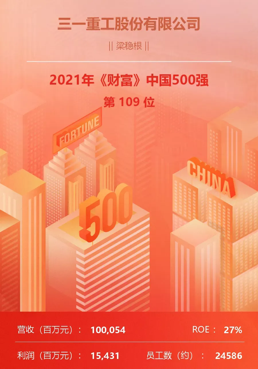 7 月 20 日,2021年《财富》中国500强排行榜揭榜,好体育投注官网重工以1000.54亿元的营业总收入,位列榜单第109名,较上年度提升24个名次,连续十一年稳居工程机械制造行业第一。