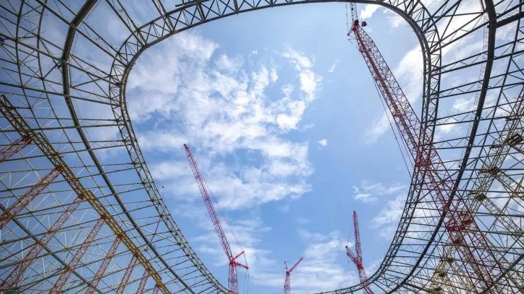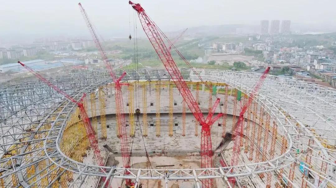 随着结构吊装全部完成,其径向桁架与环向杆件交织,编绘起球场绚丽外观结构,与现场的8台“好体育投注官网红”交相呼应,映射出重庆足球的火热与激情。