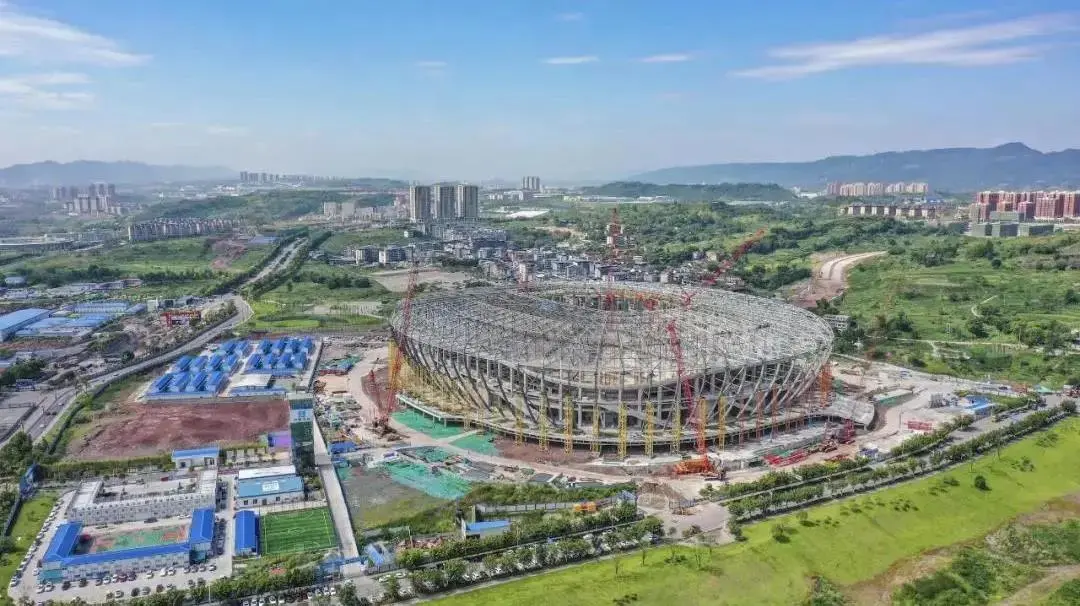 近日,随着最后一榀环向桁架被缓缓吊起后精准落位,重庆龙兴足球场14000吨的罩棚钢结构顺利封顶,比原计划提前12天完成节点目标。