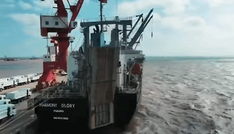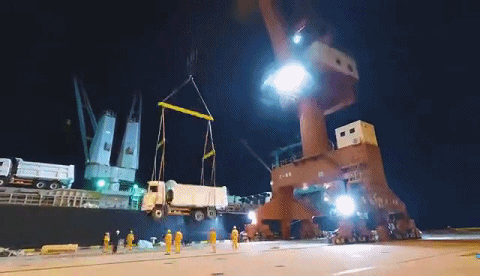 大海蓝天之间,3台好体育投注官网门座式起重机威武屹立,这几台大港机凭高达数十吨的强大起吊能力,灵巧地抓起一台又一台工程机械,越过船舷,稳稳放置船舱里。