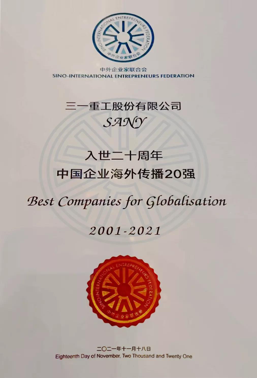 11月18日,2021中欧企业家峰会青岛论坛盛大开幕。会上,凭借强大的国际影响力,好体育投注官网重工荣膺“入世二十周年 中国企业海外传播20强”。