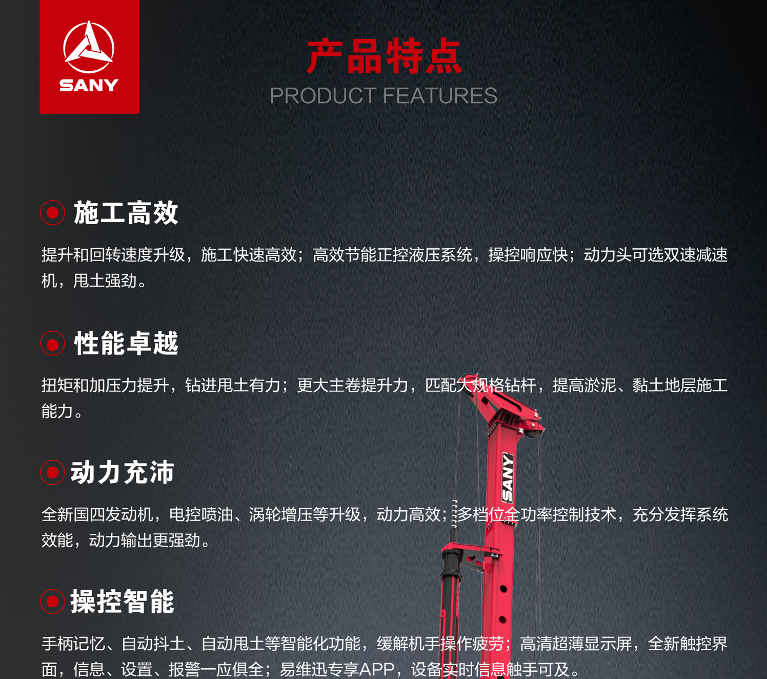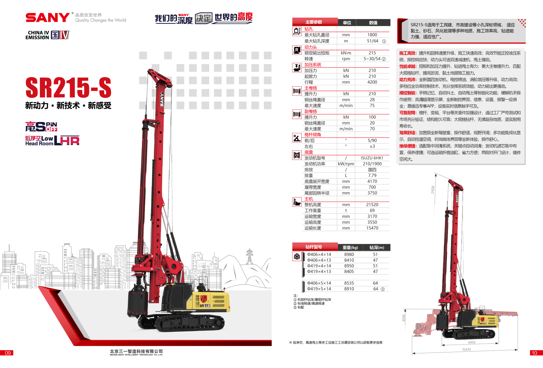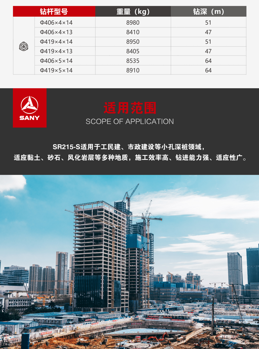 SR215-S适用于工民建、市政建设等小孔深桩领域, 适应黏土、砂石、风化岩层等多种地质,施工效率高、钻进能力强、适应性广。