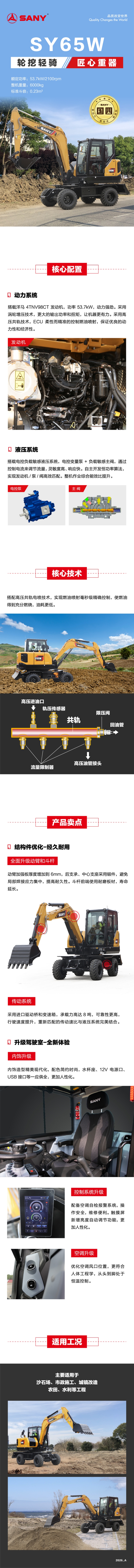 全新一代 SY65W 国四机围绕“新动力”、“新造型”、“新技术”全新升级,具有“节能高效、耐久可靠、维护成本低、智能驾乘”等特点,适用于沙石场、市政施工、城镇改造、农田、水利等工程。