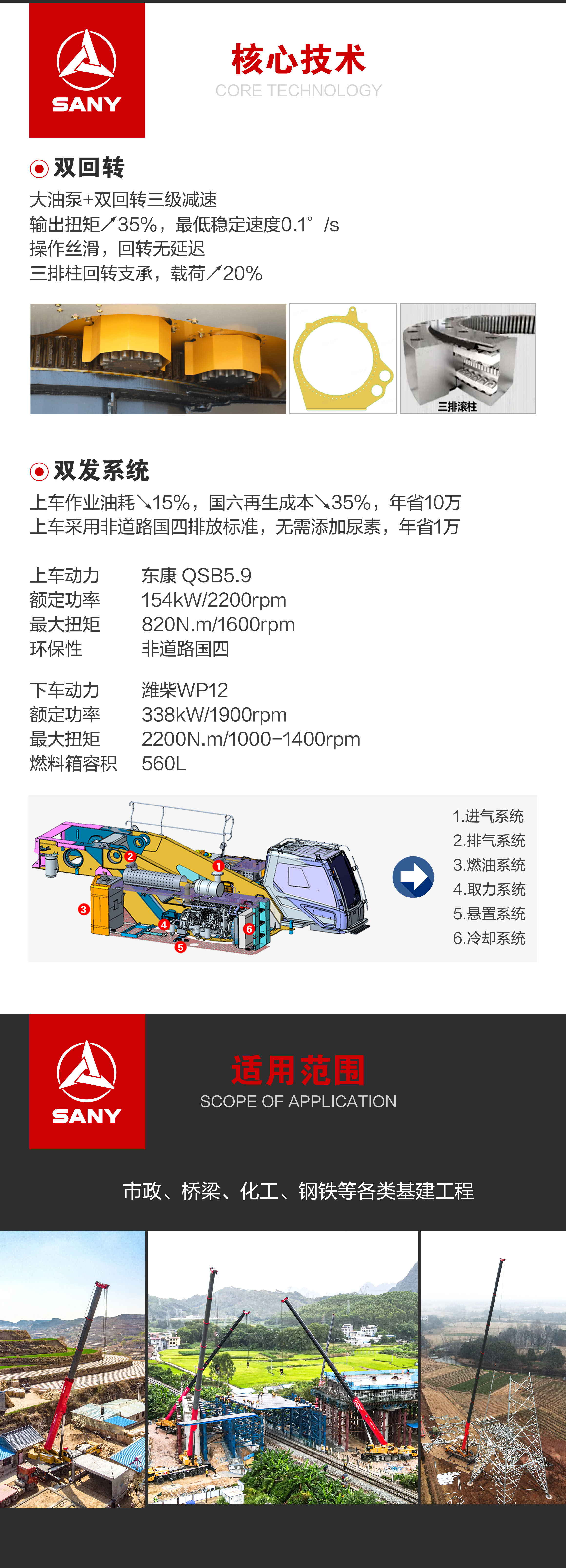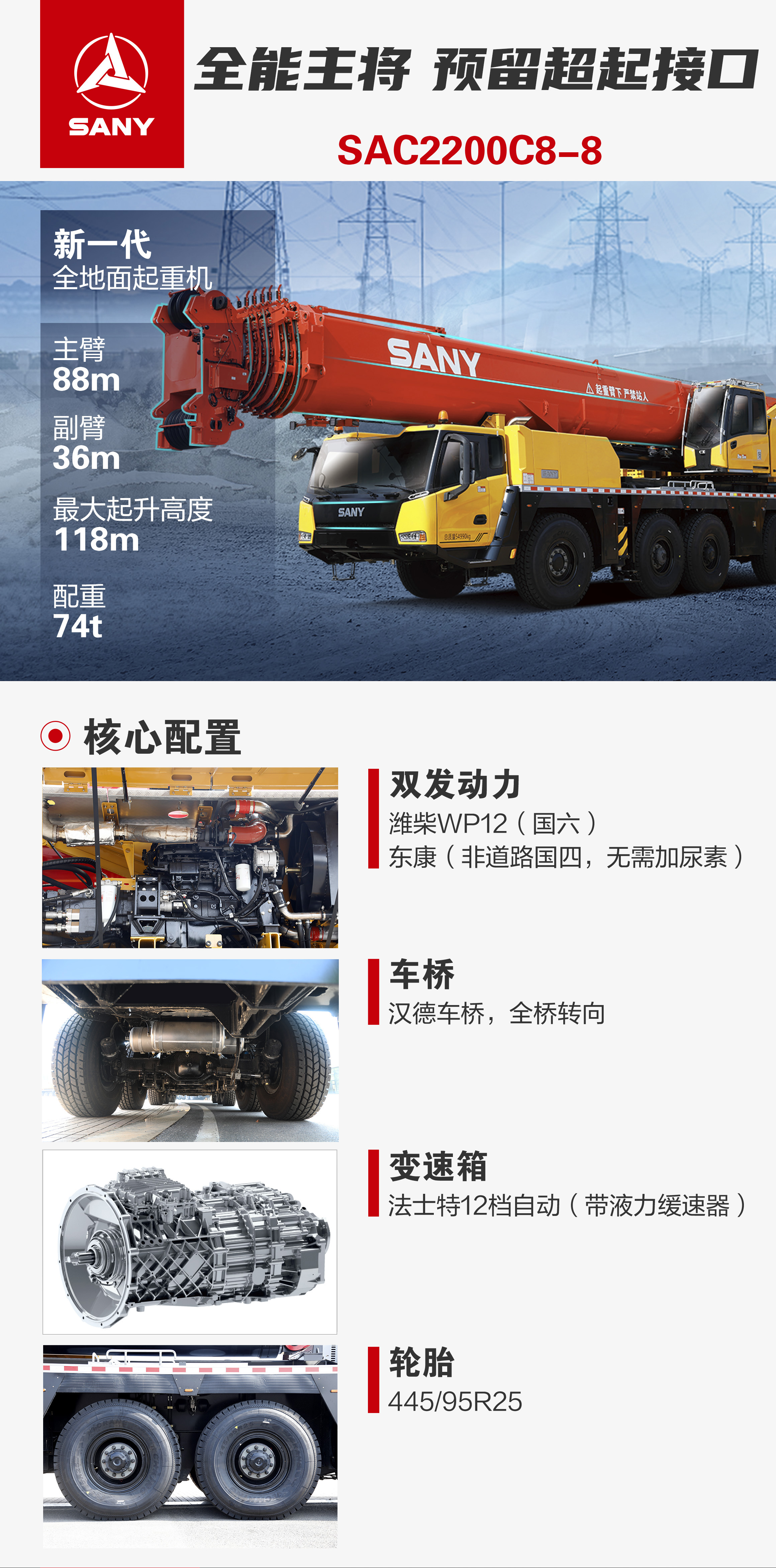 双发动力,排放升级,年省11W;标配445/95R25轮胎,泥宁坑洼不陷胎;可携带20t配重+四块支腿垫箱轻松转场。