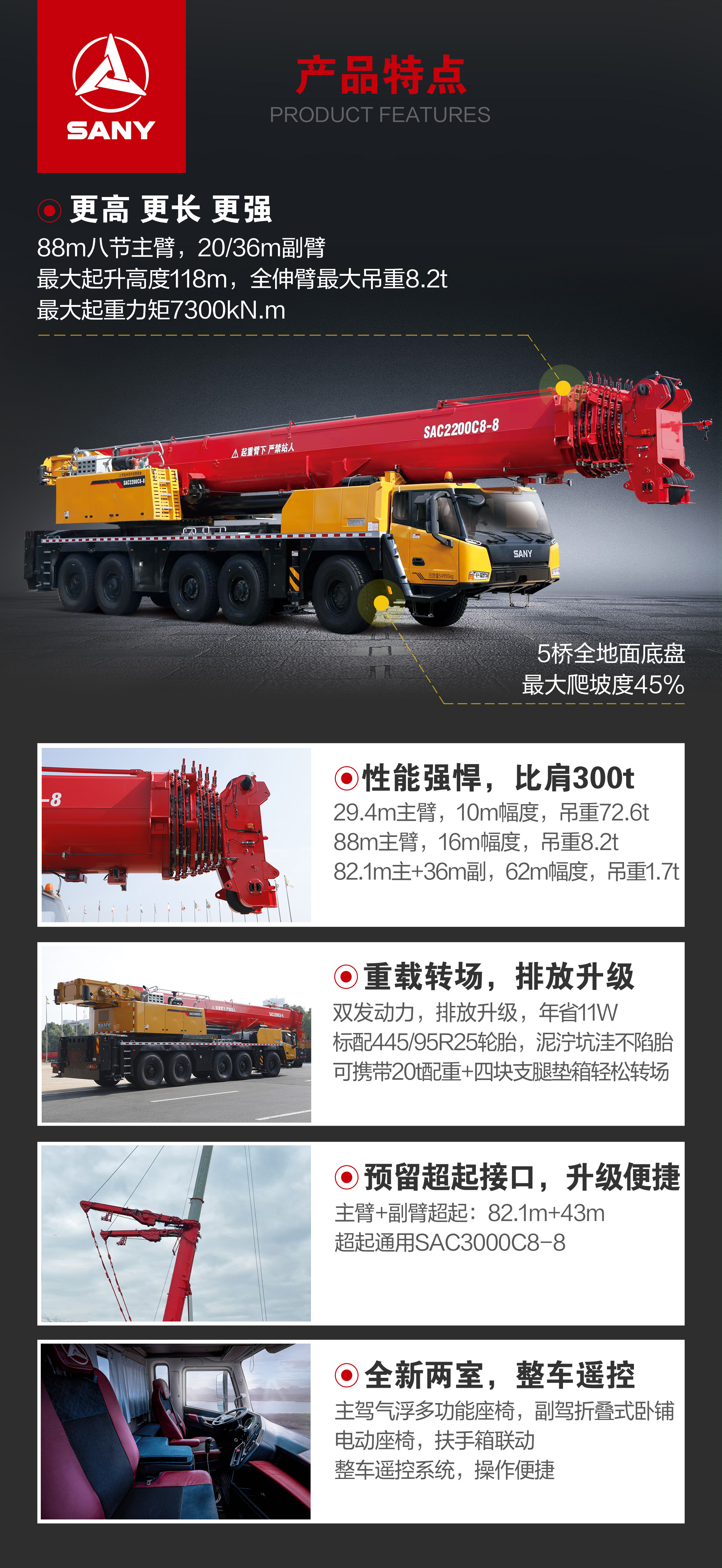 88m八节主臂,20/36m副臂;起升高度≤118m,全伸臂吊重≤8.2t;起重力矩≤7300kN.m。