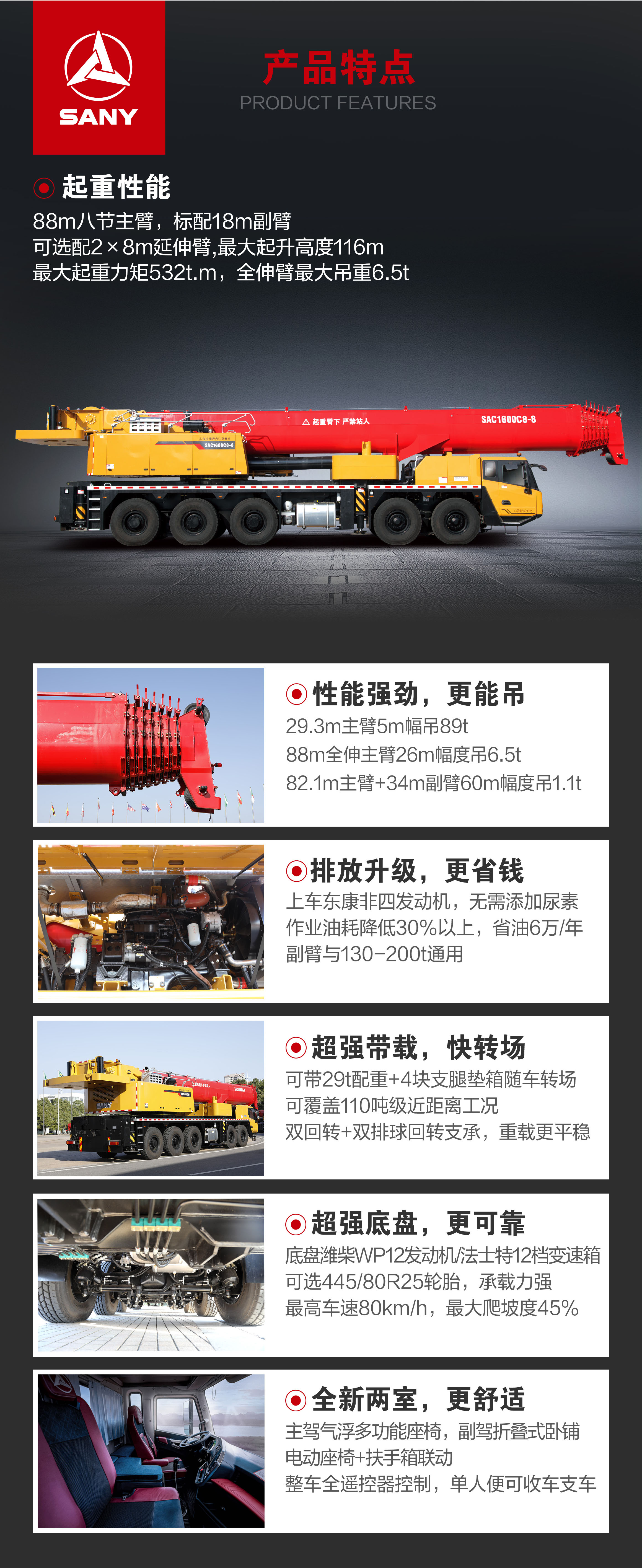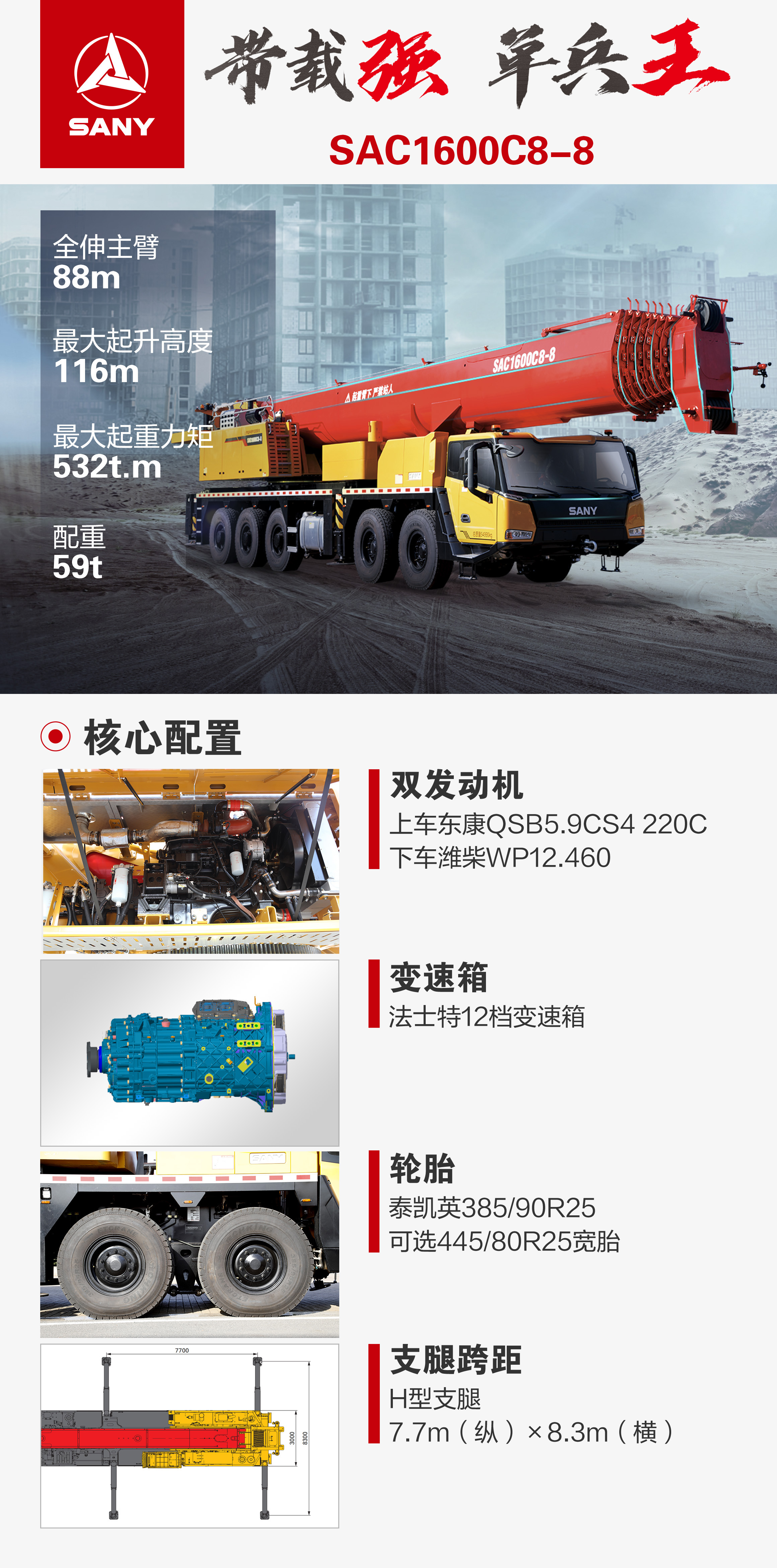 8 节 88m 卵圆形主臂,最大起重力矩 532t.m,标配副臂 18m(可选配 2×8m 延伸臂,最长至 34m) ;