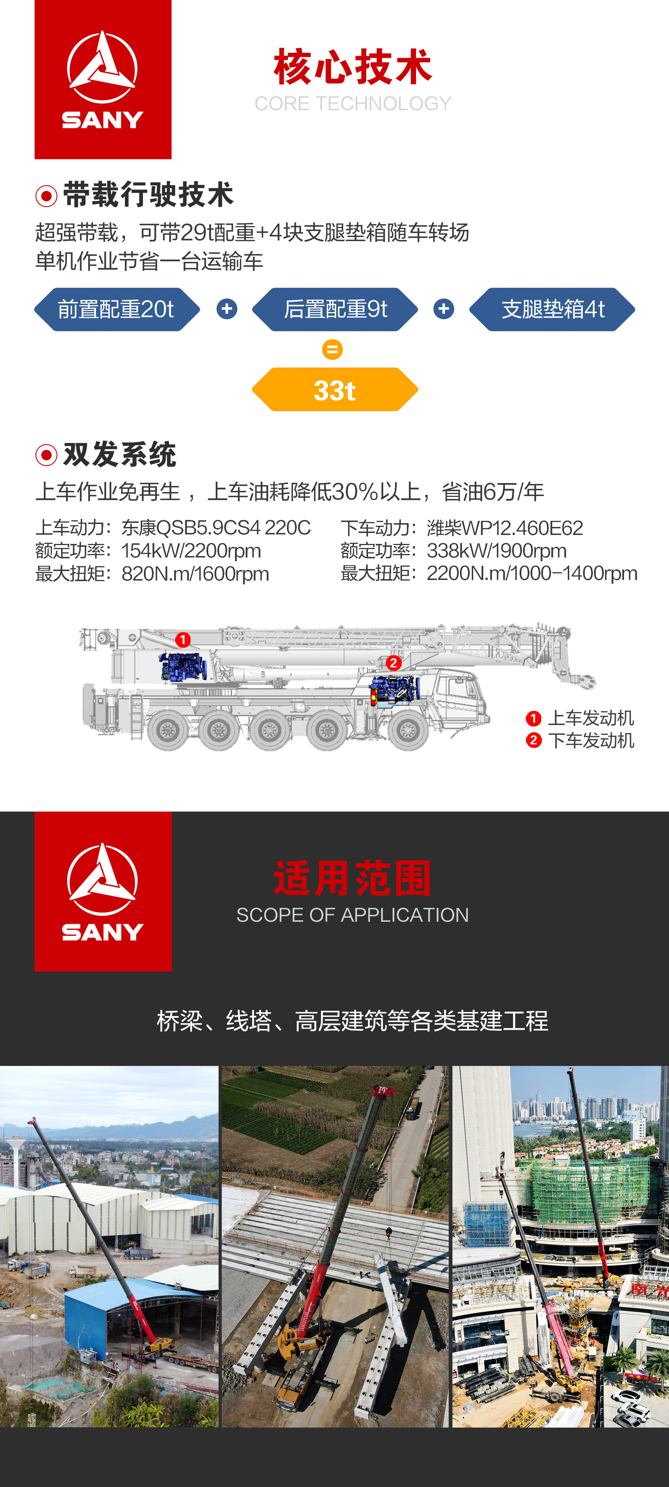 双发动机,上车东康 B5.9CS4 220C 发动机,上车作业免再生,作业油耗低 30% 以上,省油 6 万 / 年 ;