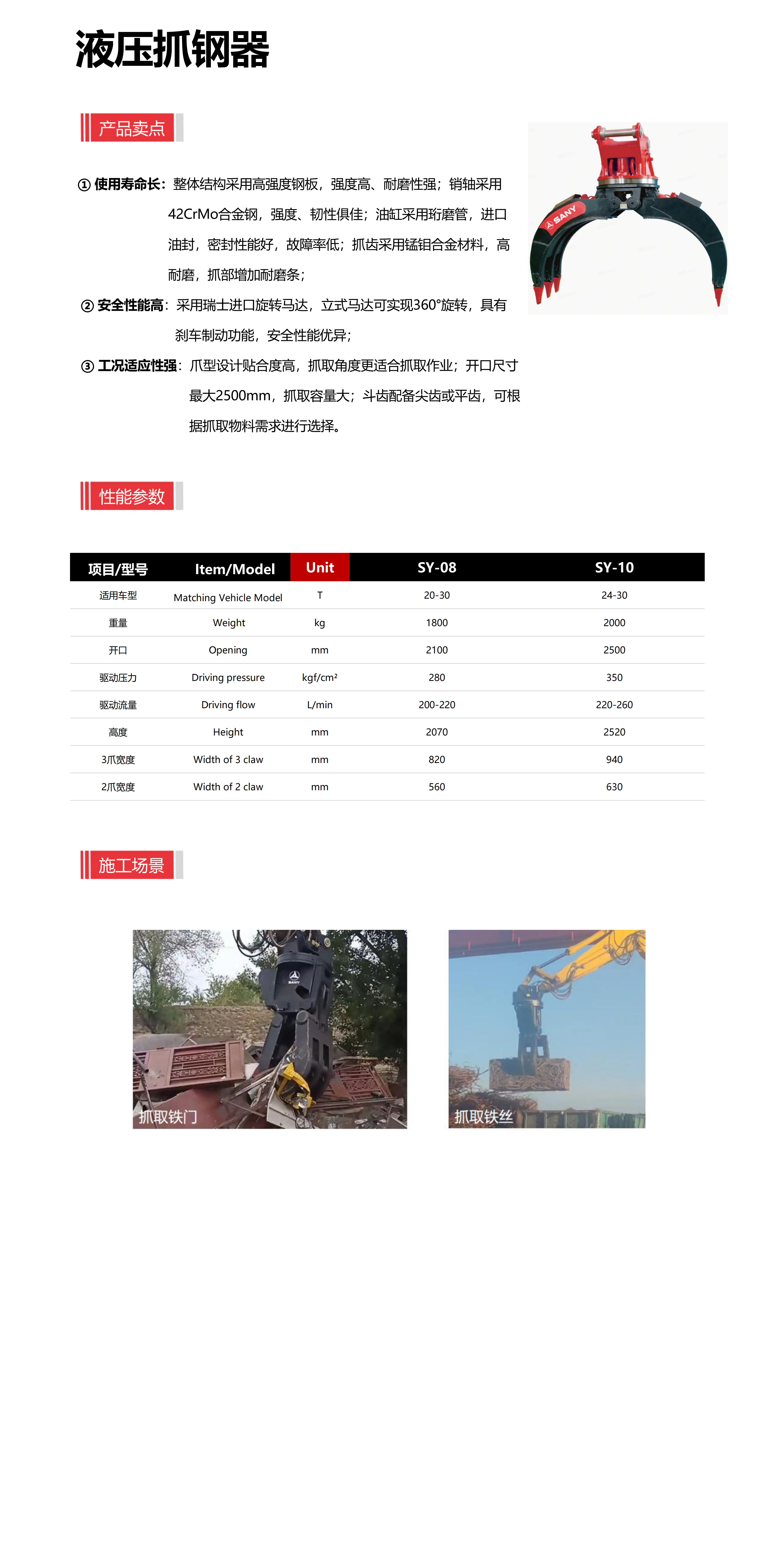 ① 使用寿命长:整体结构采用高强度钢板,强度高、耐磨性强;销轴采用42CrMo合金钢,强度、韧性俱佳;油缸采用珩磨管,进口油封,密封性能好,故障率低;抓齿采用锰钼合金材料,高耐磨,抓部增加耐磨条;