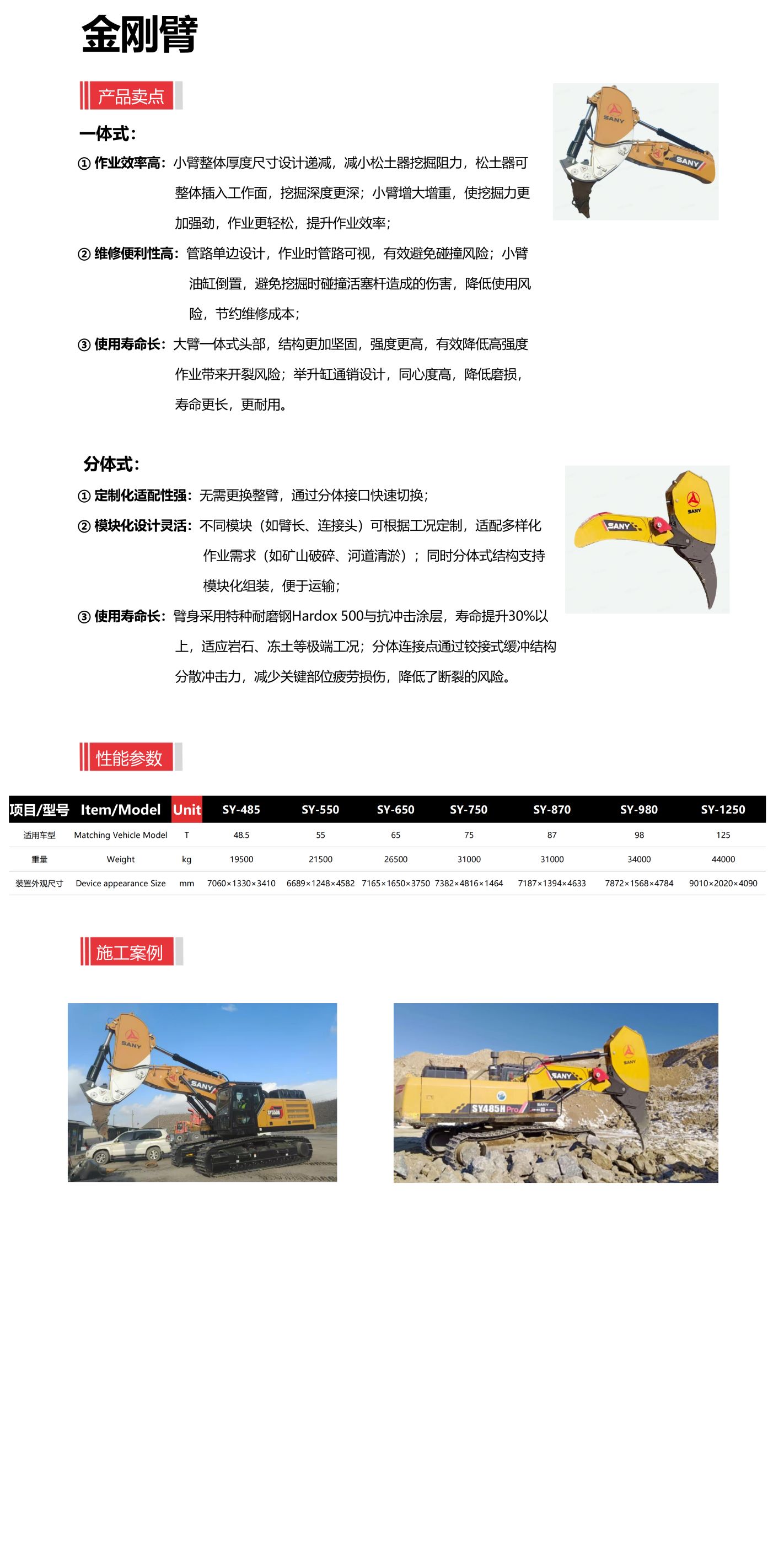 ② 模块化设计灵活:不同模块(如臂长、连接头)可根据工况定制,适配多样化作业需求(如矿山破碎、河道清淤);同时分体式结构支持模块化组装,便于运输;