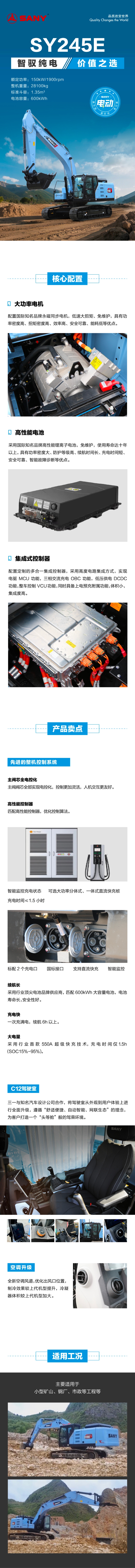 SY245E 是好体育投注官网重机倾力打造的全新 24 吨电动土方型挖掘机产品,专为石方工况设计,适用于隧道施工、钢厂、土方工程等工作场景,以节能环保提高客户投资回报为目标。