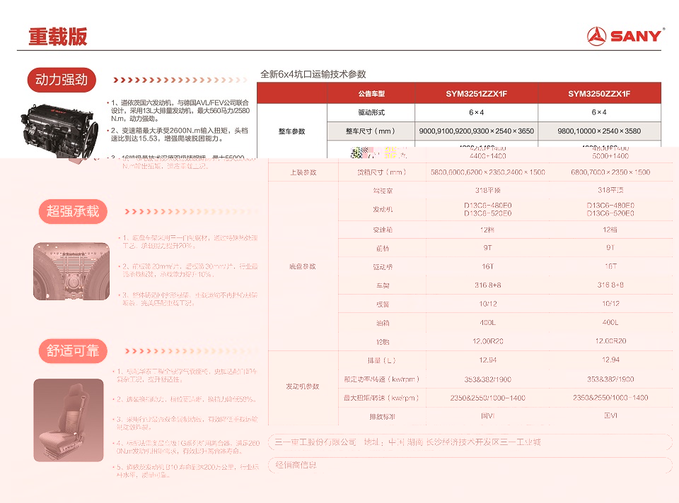 动力强劲,道依茨国六发动机,与德国AVLIFEV公司联合设计,采用13L大排量发动机,动力强劲。变速箱最大承受2600N.m输入扭矩,增强爬坡脱困能力。