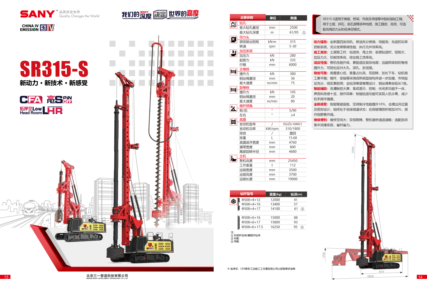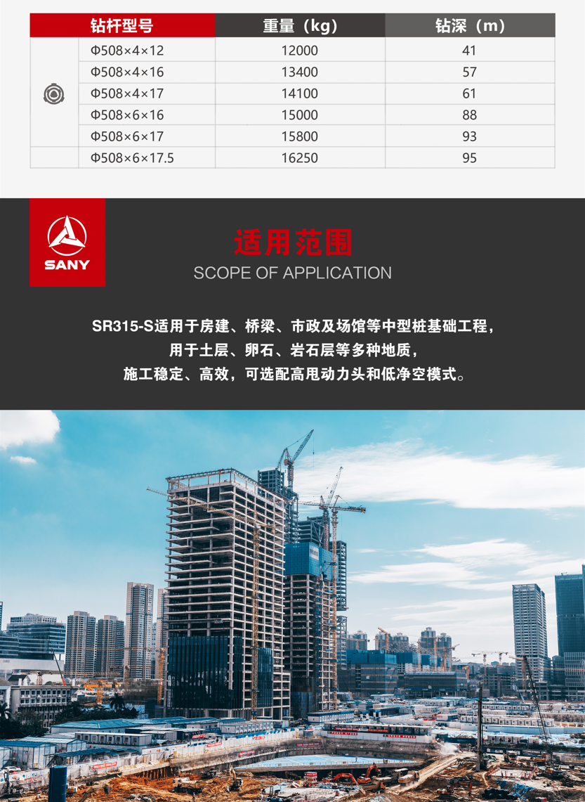 SR315-S适用于房建、桥梁、市政及场馆等中型桩基础工程,用于土层、卵石、岩石层等多种地质,施工稳定、高效,可选配高甩动力头和低净空模式。